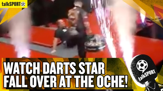 He quickly jumped back up, looking a little flustered, and then had to limp to the oche for the warm up.